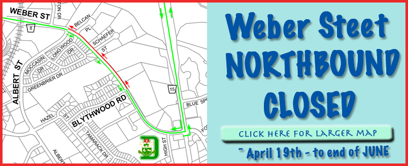Please refer to the map (and the link for larger map) below to view where Weber Street NORTHBOUND will be closed from about April 19th to the end of the school year.